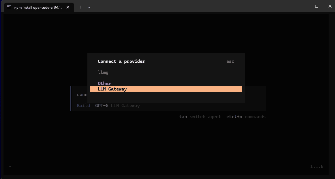 Once OpenCode launches, run the /connect command to connect to LLM Gateway: